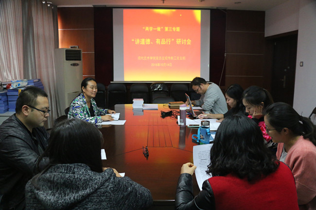 10月14日下午,现代艺术学院党总支视觉传达设计教工党支部在会议室召开“两学一做”第三专题“对照讲道德、有品行标准,反思修身律己情况,增强道德修养”学习研讨会。党总支书记王晓征及视觉传达设计系教工党员参加了会议。会议由支部书记杜霞主持。